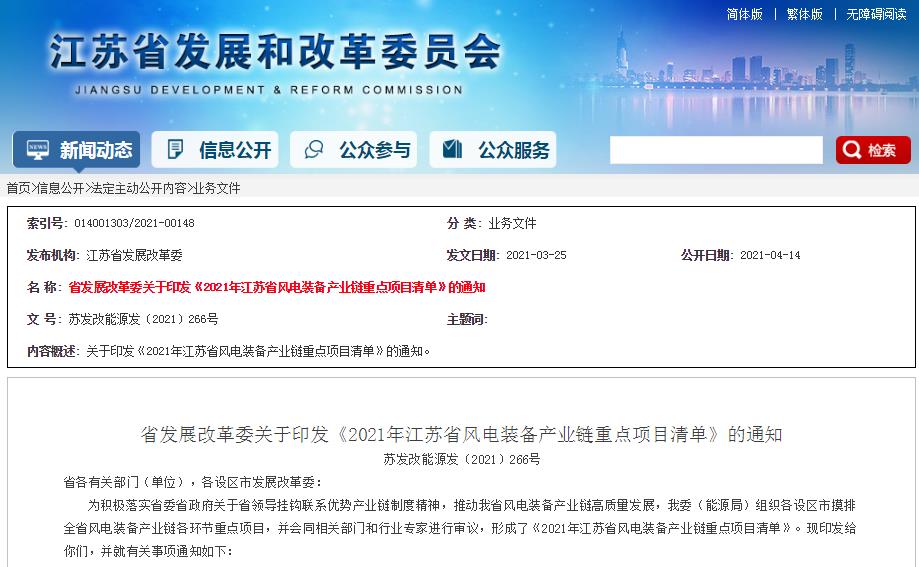 省發(fā)展改革委關(guān)于印發(fā)《2021年江蘇省風(fēng)電裝備產(chǎn)業(yè)鏈重點項目清單》的通知——蘇發(fā)改能源發(fā)〔2021〕266號